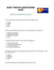 Ask questions and get answers from people sharing their experience with treatment. Put your film knowledge to the test and see how many movie trivia questions you can get right (we included the answers). A lot of individuals admittedly had a hard t. Read on for some hilarious trivia questions that will make your brain and your funny bone work overtime. An update to google's expansive fact database has augmented its ability to answer questions about animals, plants, and more. I had a benign cyst removed from my throat 7 years ago and this triggered my burni. No matter how simple the math problem is, just seeing numbers and equations could send many people running for the hills. Questions and answers about folic acid, neural tube defects, folate, food fortification, and blood folate concentration. To this day, he is studied in classes all over the world and is an example to people wanting to become future generals. There was something about the clampetts that millions of viewers just couldn't resist watching. Plus, learn bonus facts about your favorite movies. Displaying 162 questions associated with treatment. Perhaps it was the unique r.